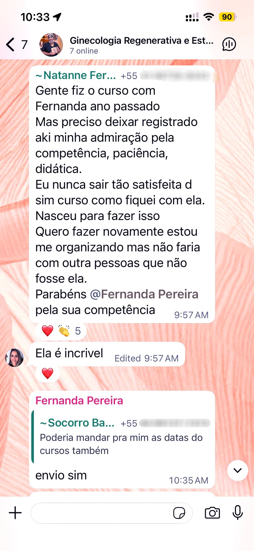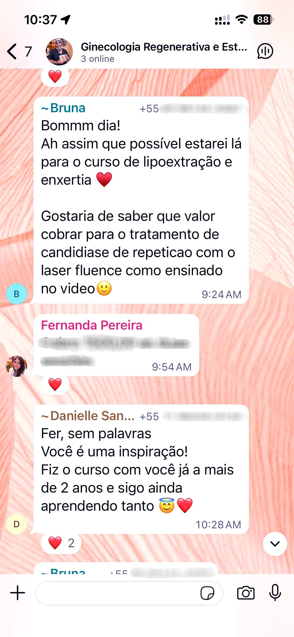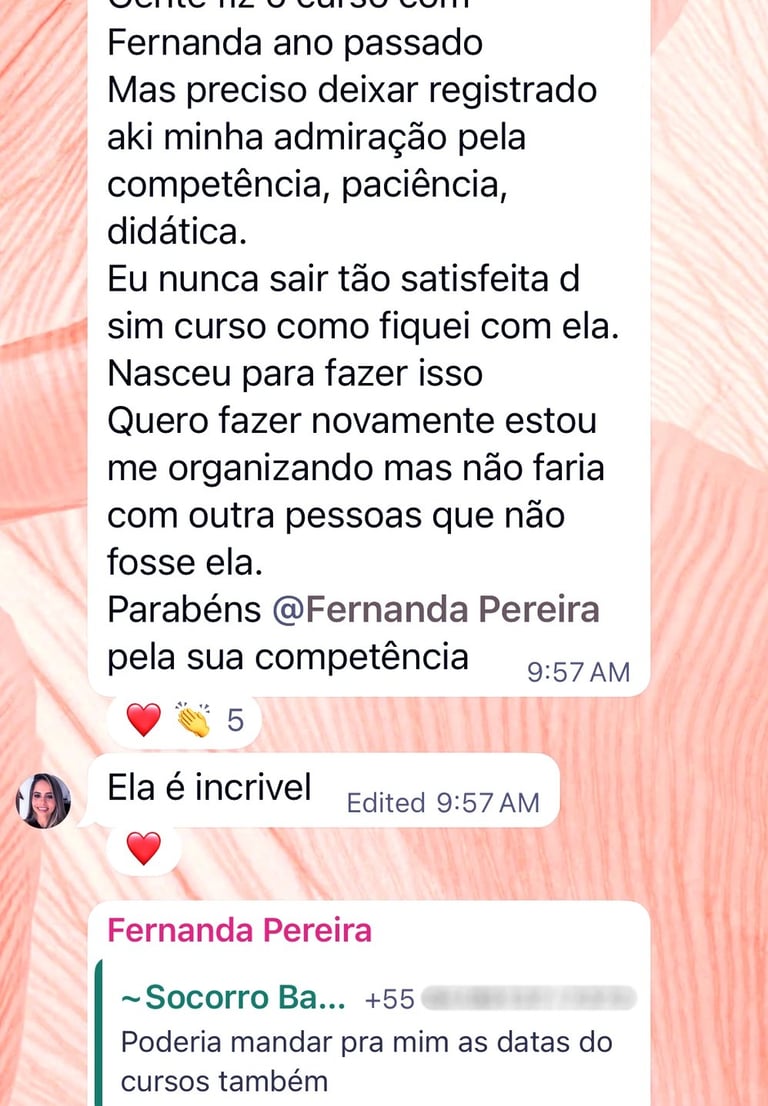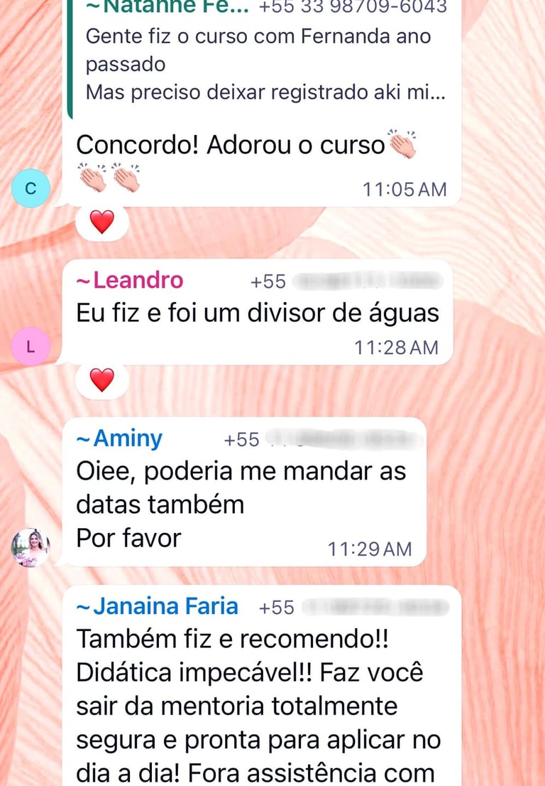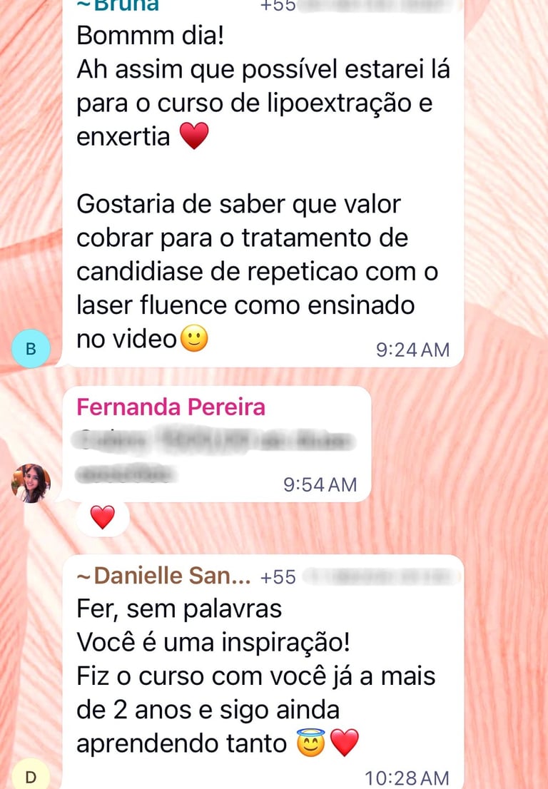 Ao entrar no curso, você também terá acesso direto à Dra. Fernanda para esclarecimento de dúvidas e será convidado a participar de um grupo exclusivo no WhatsApp, com mais de 150 médicos de todo o Brasil. Um espaço liderado pela própria Dra. Fernanda para troca de experiências, discussão de casos e networking entre profissionais da área.